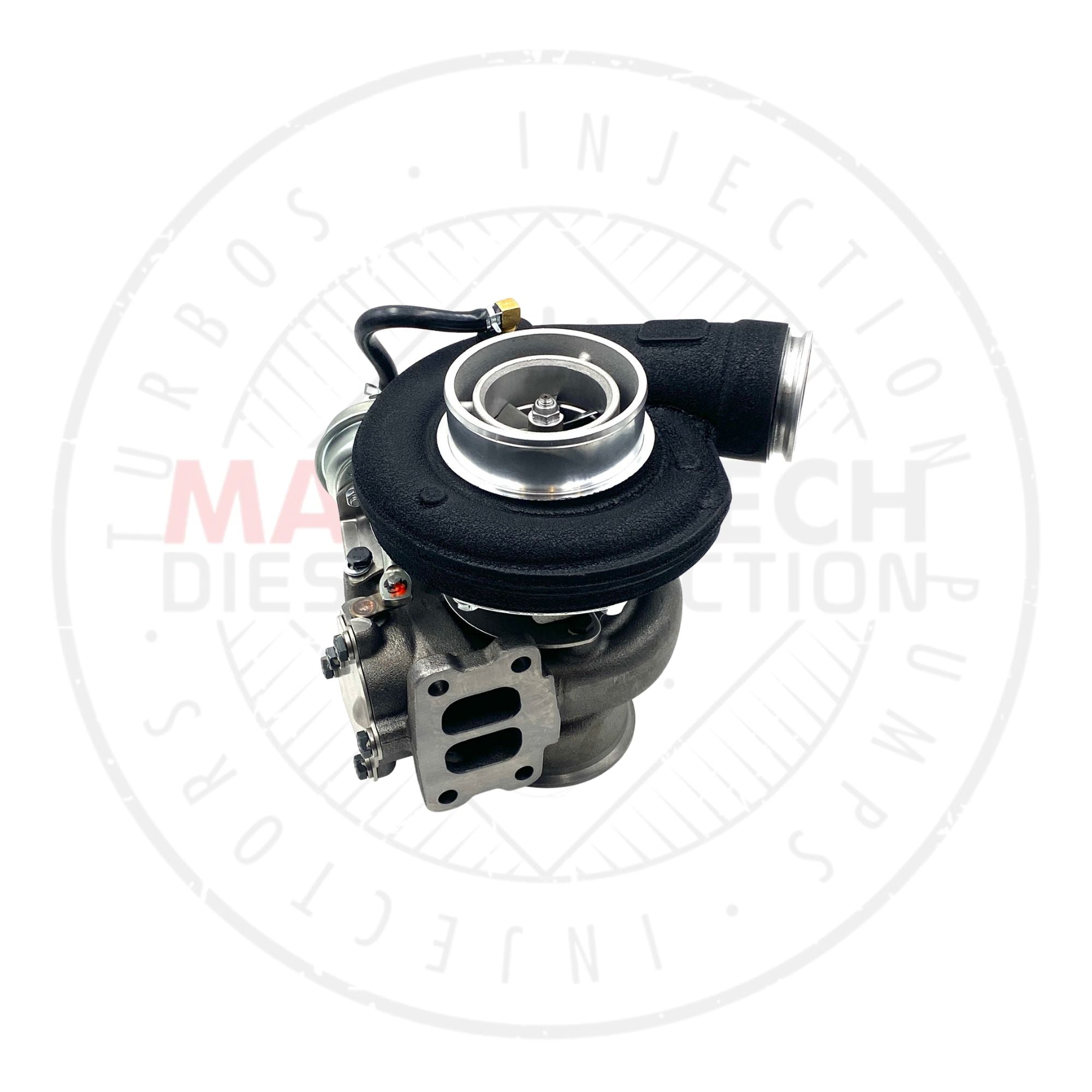 New S300 62/65 Phatshaft turbo for 2004.5-2007 5.9L Dodge Ram. This turbo exhaust flange works with the factory exhaust elbow and downpipe with the 325HP HO engines. Performance tuning and or fuel modifications such as 50-90HP injectors are required to spool this turbo. The waste gate is set to 40PSI to prevent turbo overspeed and head gasket failure.